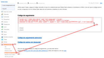 Después de hacer clic en el enlace de nuestra página web veremos el panel completo ya con información más detallada, ahora solo tendra que seguir las instrucciones que se muestran en la siguiente imagen para copiar el código de seguimiento de sus estadísticas y colocarlo en su respectiva página web.